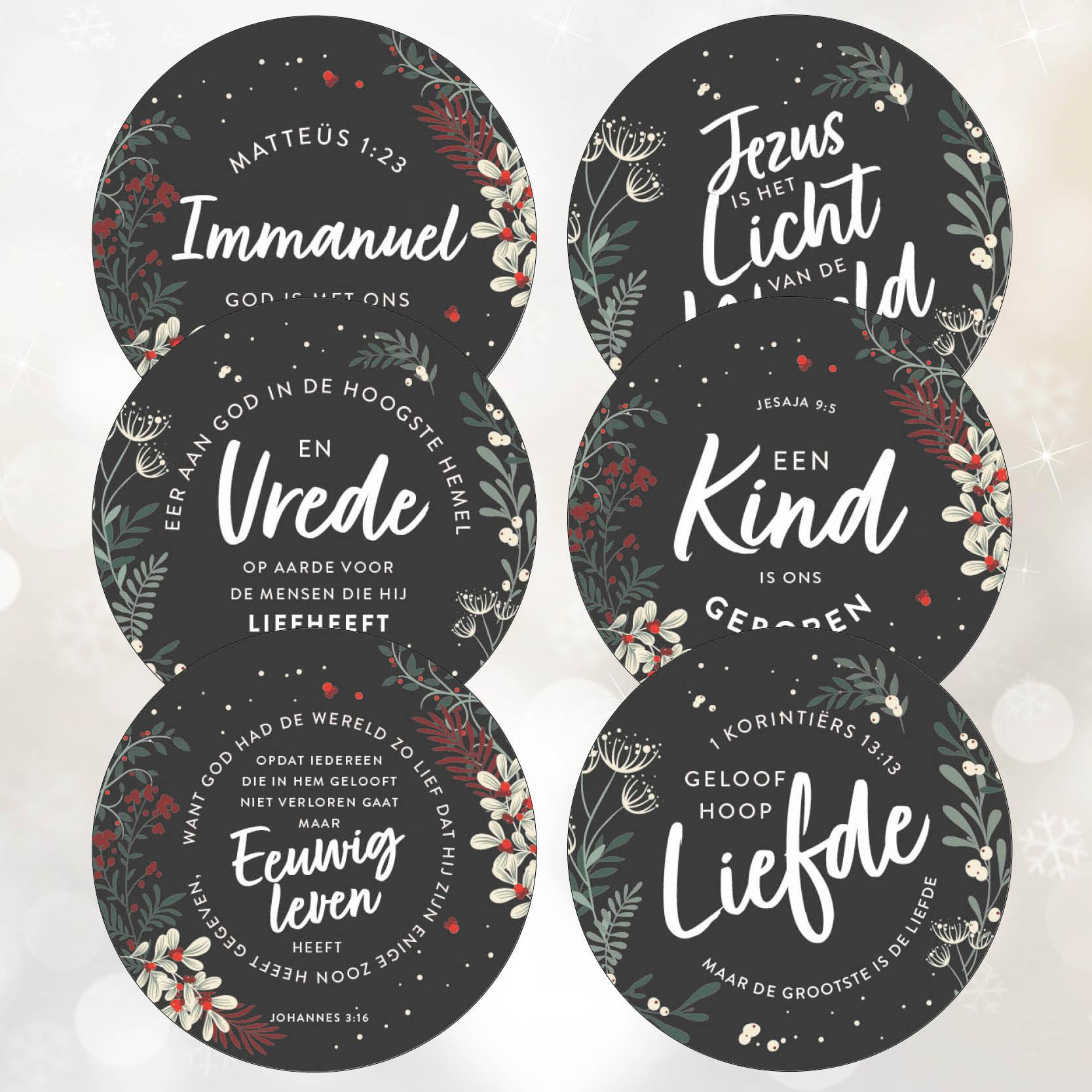 Elk onderzettertje is prachtig versierd met fijne motieven van hulst en bloemen, en met een bijbeltekst die past bij Kerst.