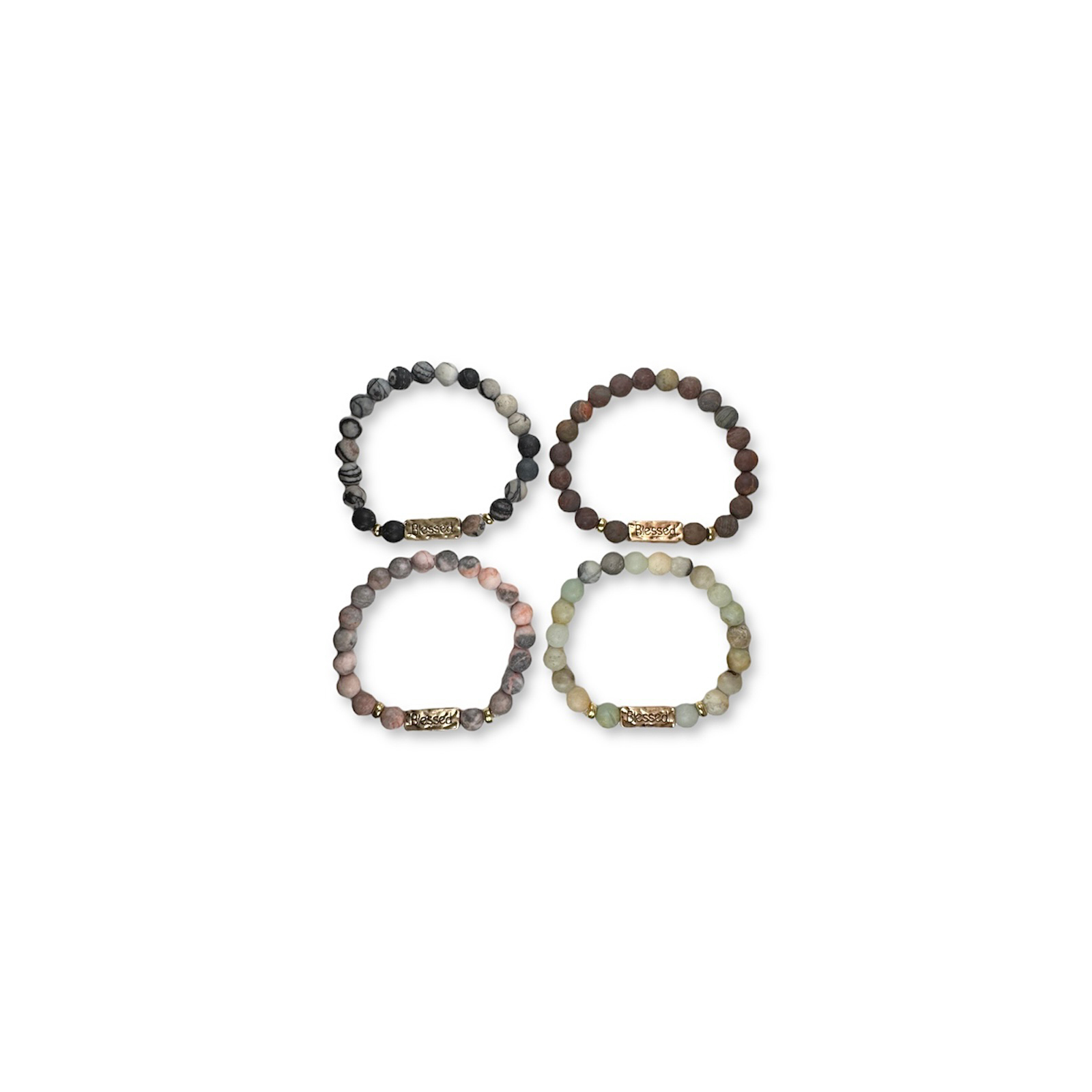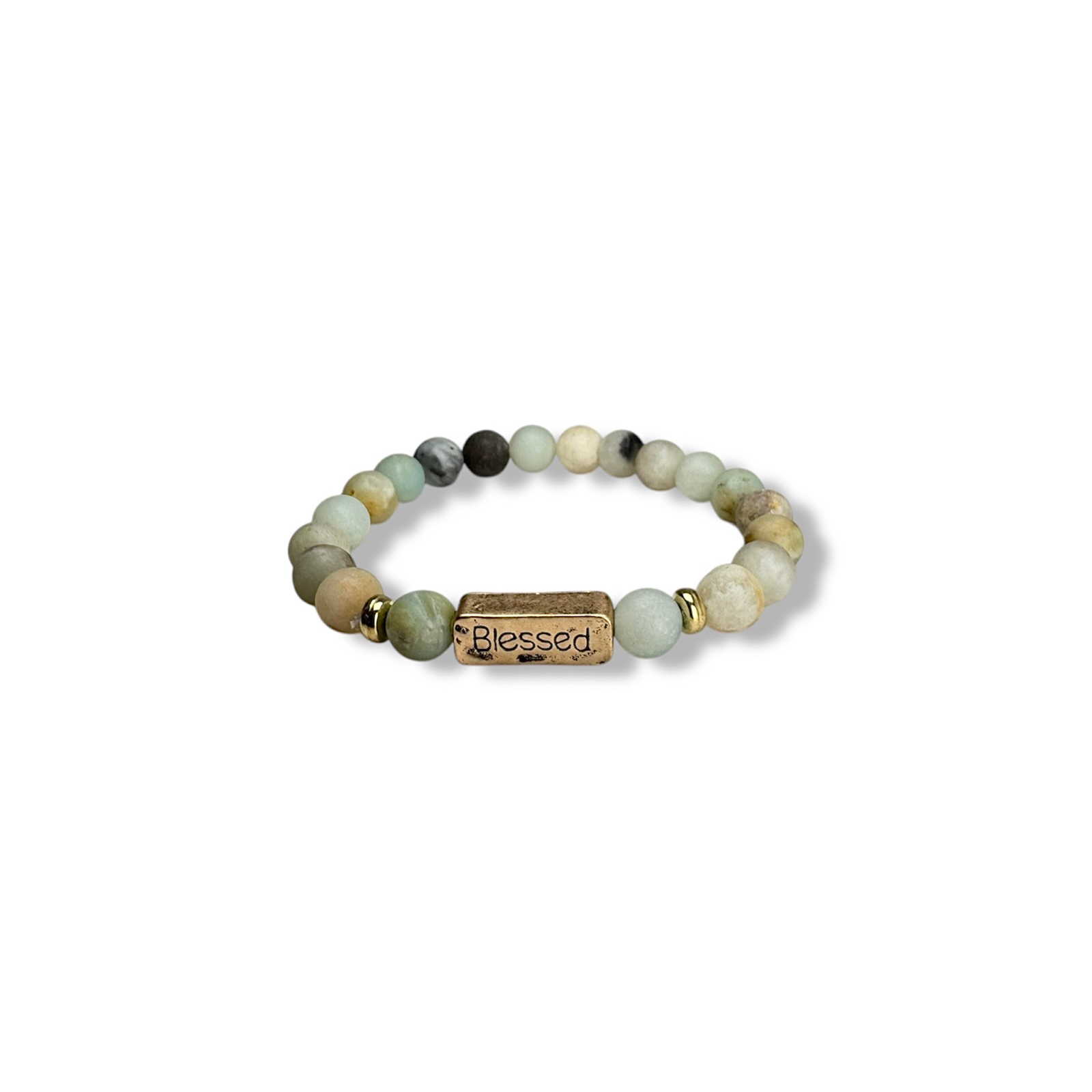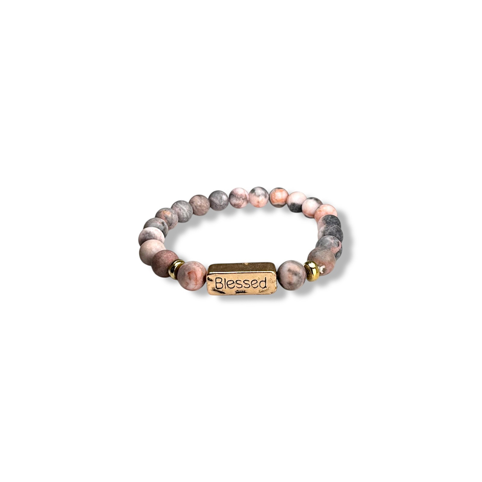 Prachtige natuurstenen armband met goudkleurige accenten en de gravure ‘Blessed’.