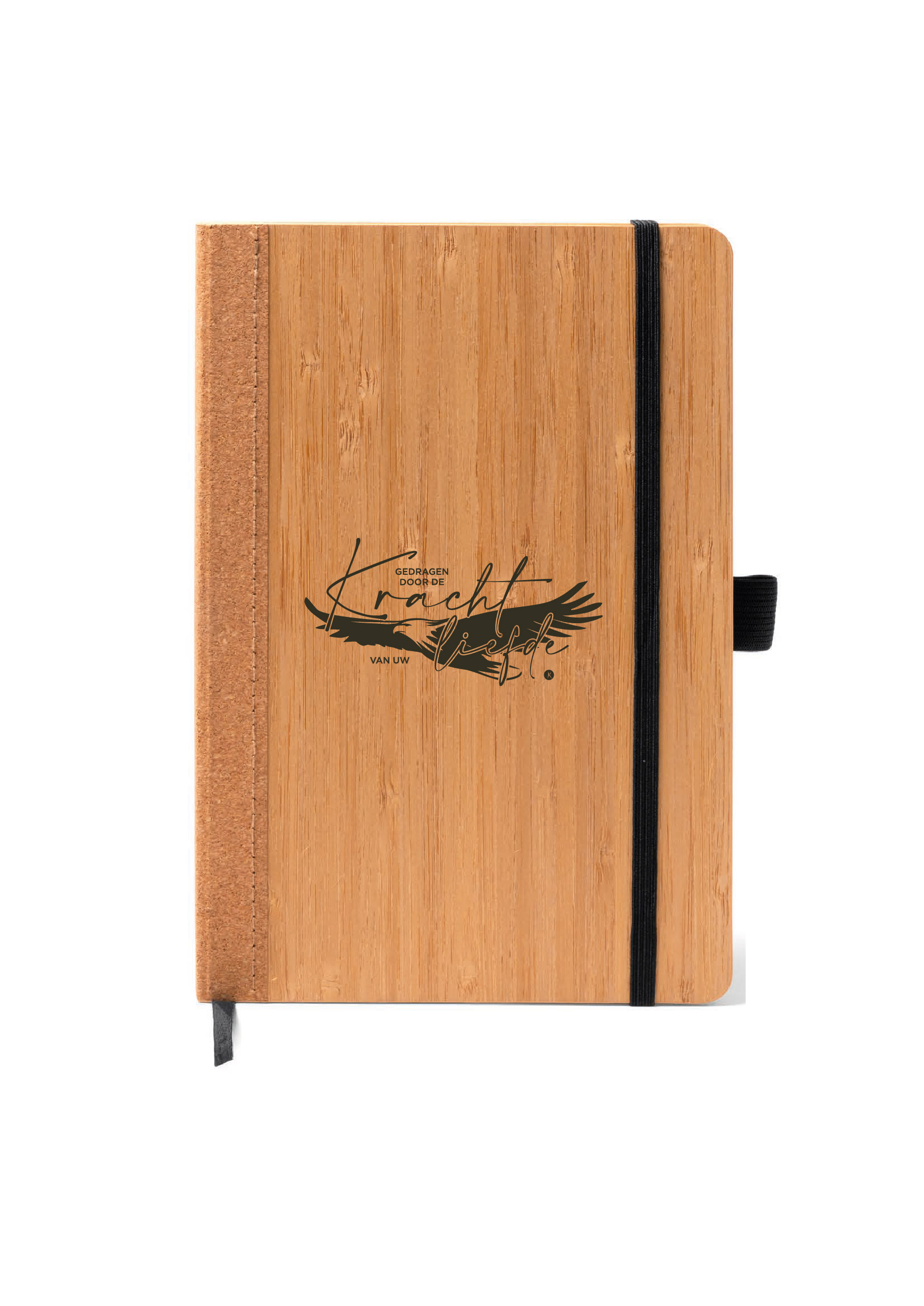 Dit bamboe notitieboekje ‘Kracht’ in A5 formaat bevat aan de binnenzijde lijntjes zonder tekst of afbeelding.