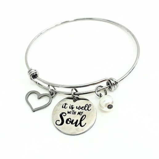 Bangle met hartje, parel en hanger ‘It is well with my soul’.