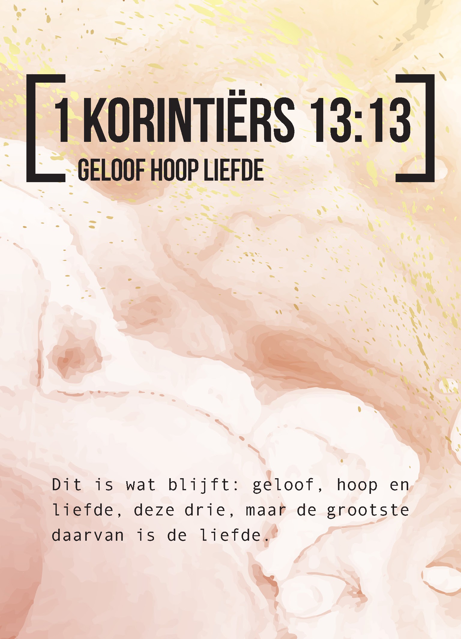 1 Korinthiërs 13:13: ‘Dit is wat blijft: geloof, hoop en liefde, deze drie, maar de grootste daarvan is de liefde’.’ (NBV21)