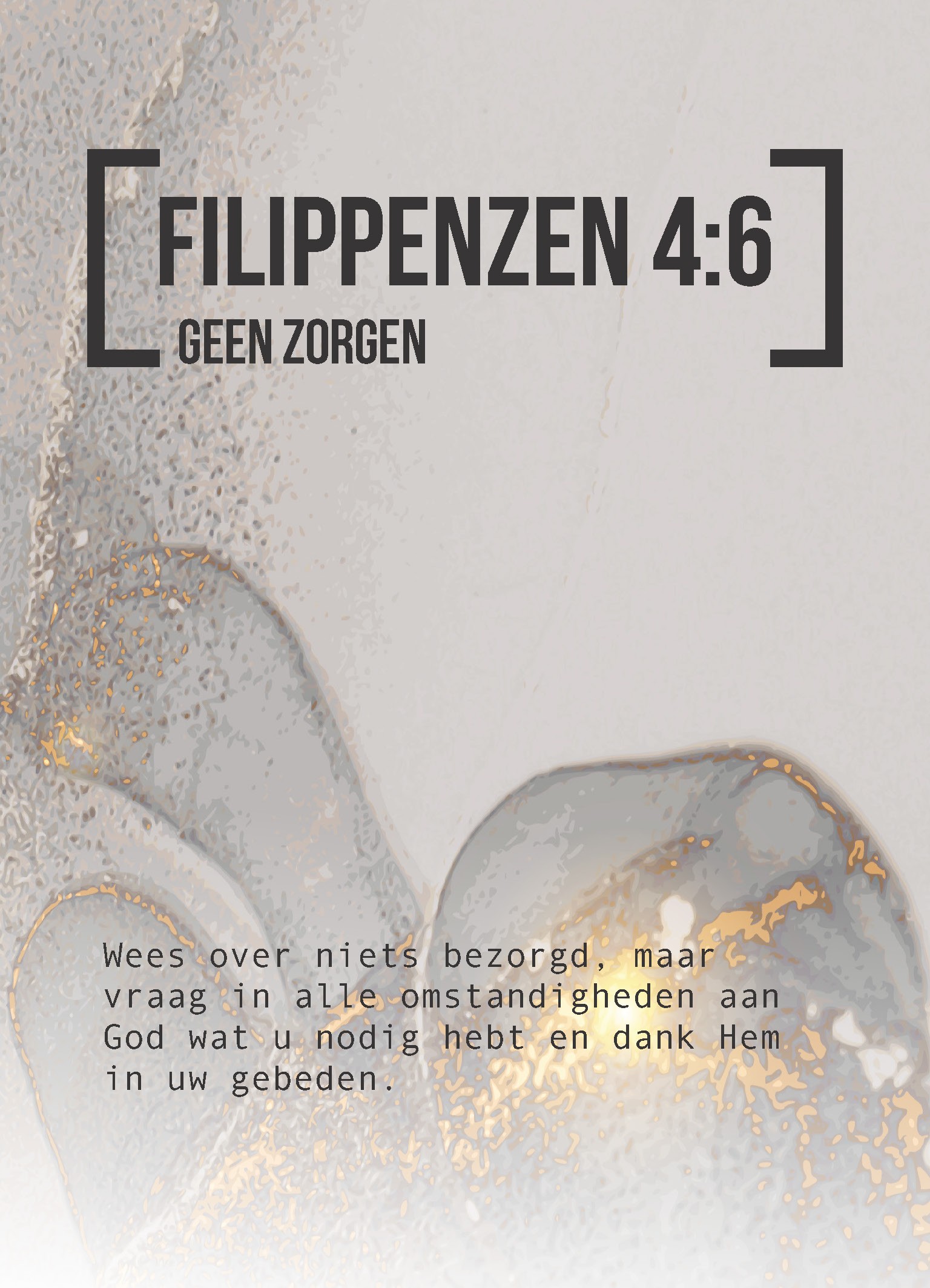 Filippenzen 4:6: ‘Wees over niets bezorgd, maar vraag in alle omstandigheden aan God wat u nodig hebt en dank Hem in uw gebeden’. (NBV21)
