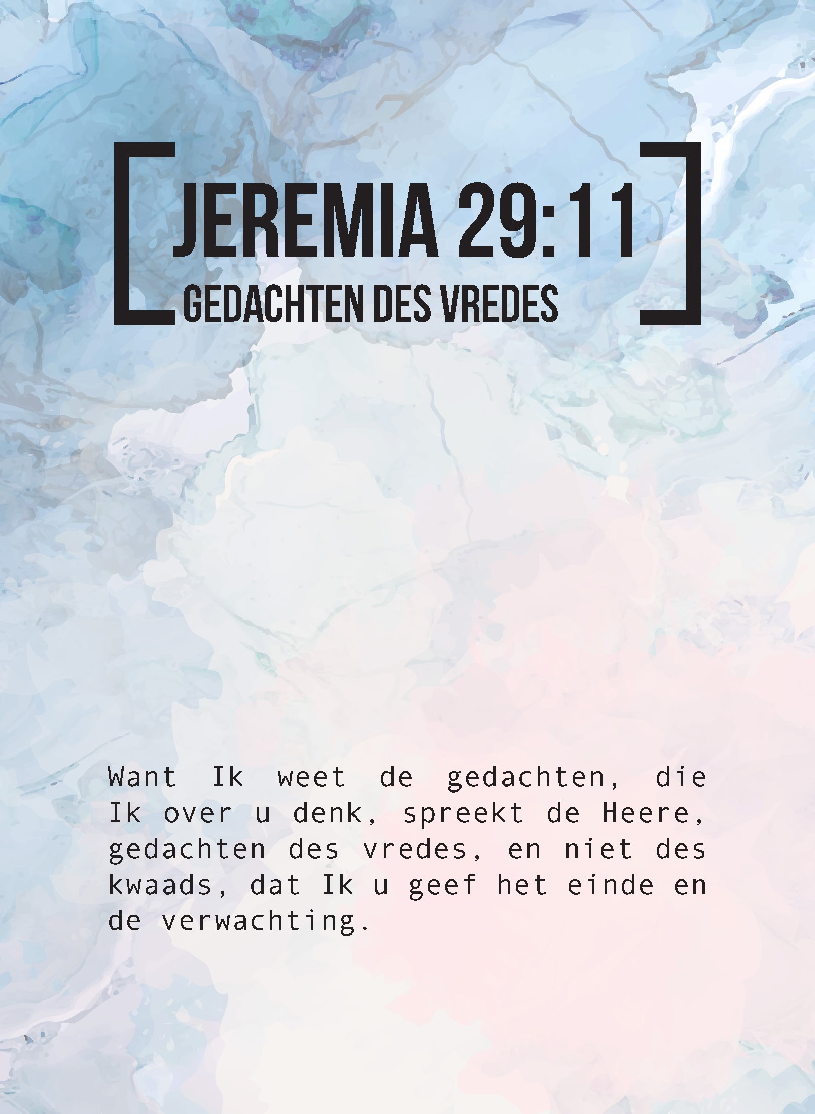 Jeremia 29:11: ‘Want Ik weet de gedachten, die Ik over u denk, spreekt de Heere, gedachten des vredes, en niet des kwaads, dat Ik u geef het einde en de verwachting.’ (SV)