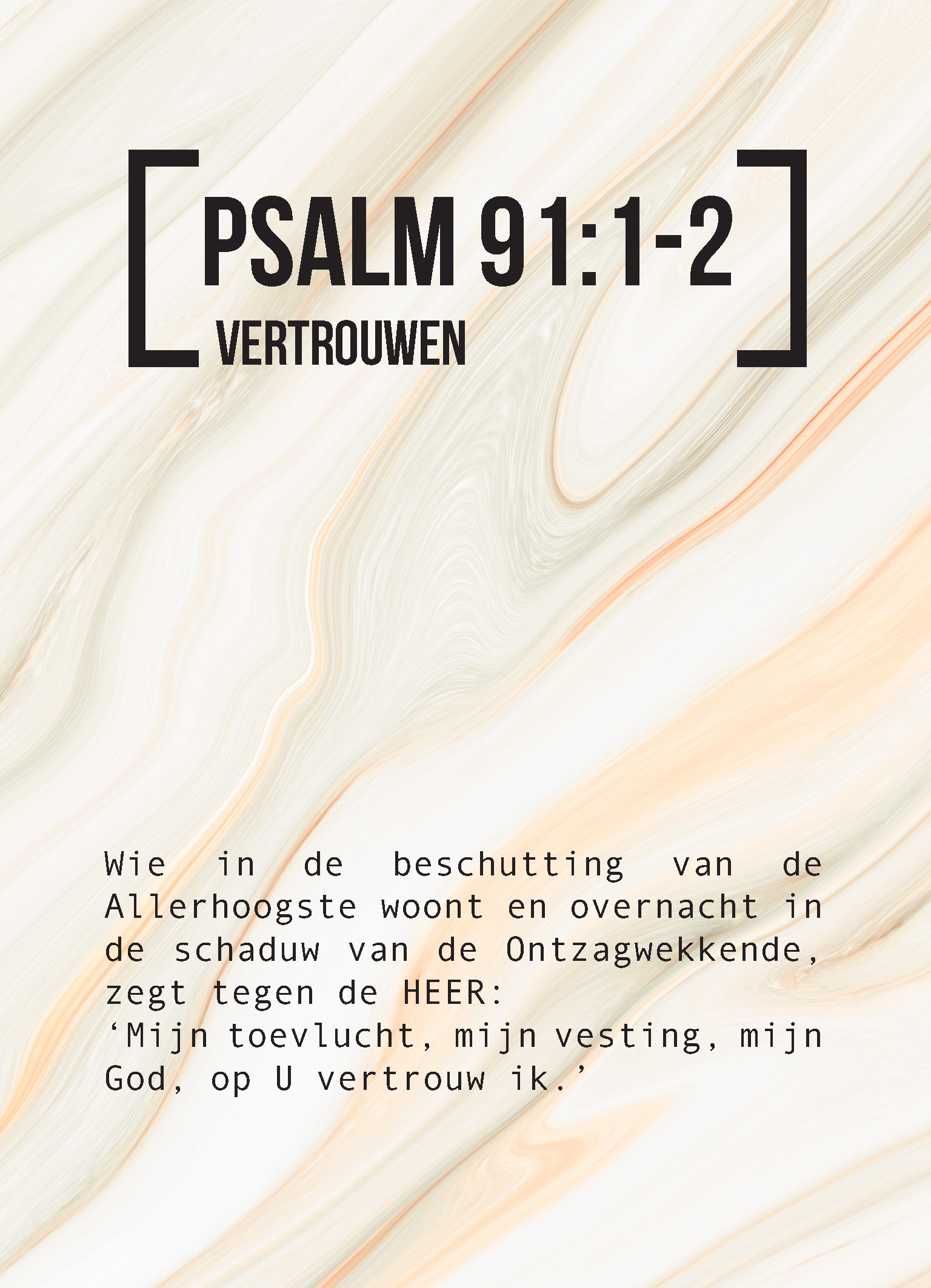 Psalm 91:1-2: ‘Wie in de beschutting van de Allerhoogste woont en overnacht in de schaduw van de Ontzagwekkende, zegt tegen de HEER: ‘Mijn toevlucht, mijn vesting, mijn God, op U vertrouw ik’.’ (NBV21)