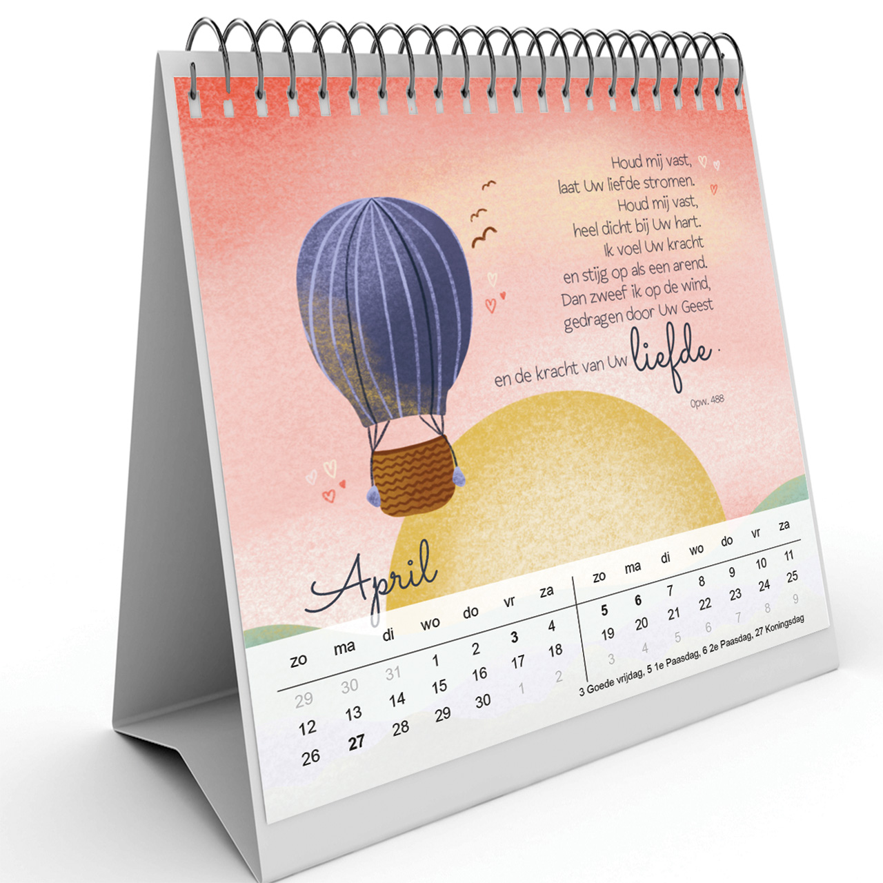 Kleurrijke bureaukalender met vrolijke designs van Marjolein Creations en inspirerende teksten uit de Opwekkingsbundel.