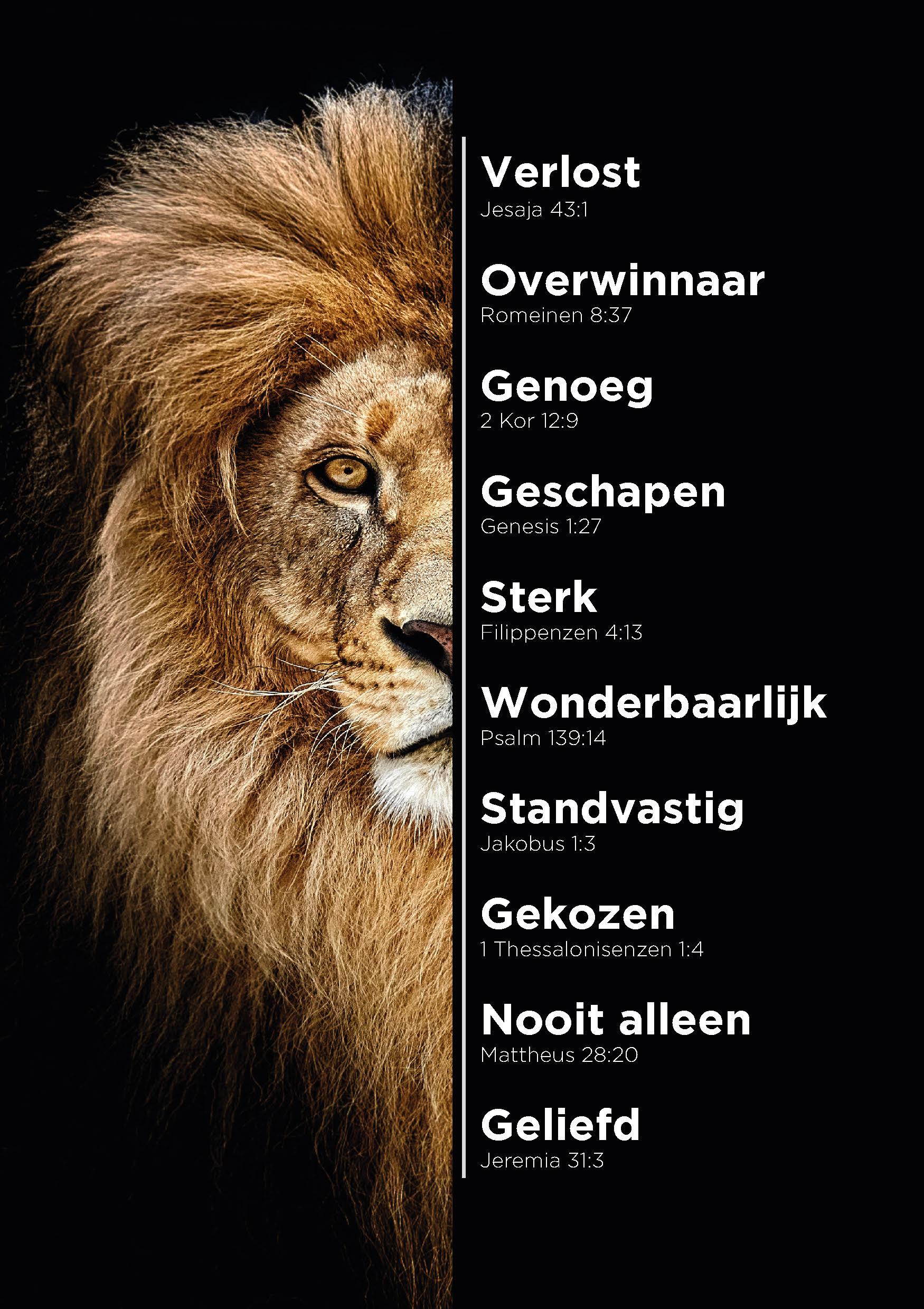 Laat je bemoedigen door de prachtige woorden die God over je spreekt! Dit bord in A4-formaat met de afbeelding van een leeuw is mooi voor jezelf als herinnering, maar ook mooi om weg te geven als geschenk.