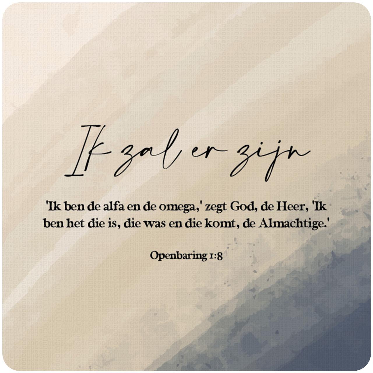 Prachtig Courage cadeaubordje met de tekst ‘Ik zal er zijn. Ik ben de alfa en de omega, zegt God, de Heer,’Ik ben het die is, die was en die komt, de Almachtige. Openbaring 1:8’.