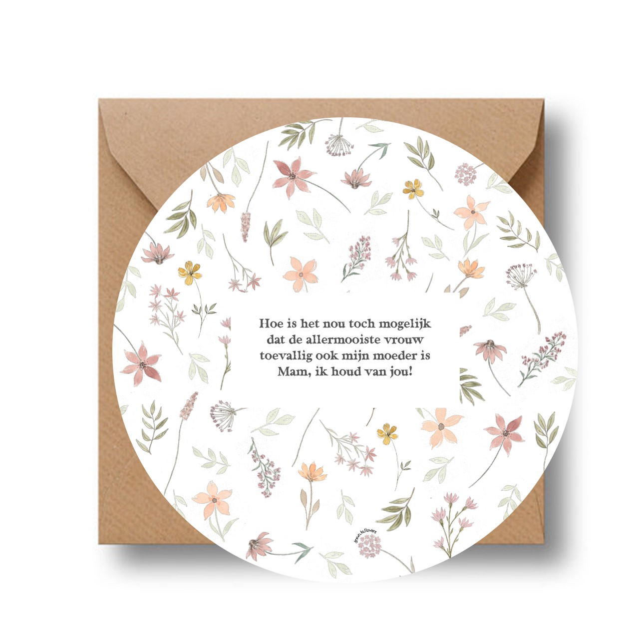Rond cadeaubordje uit de serie ‘Cirkelcadeau’ van karton. Mooi om te sturen rond moederdag, of wanneer dat je aan je moeder wilt laten weten wat ze voor je betekent. Ook mogelijk om op te hangen met dubbelzijdig tape of tesa strip (niet meegeleverd).