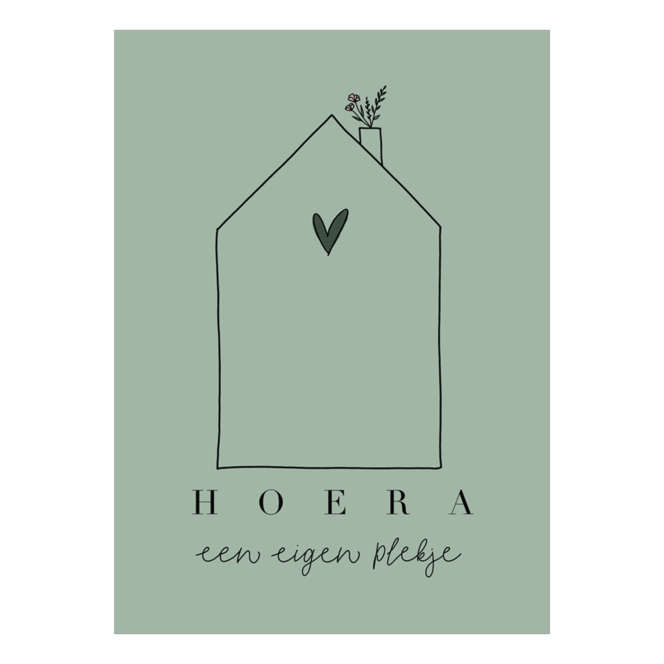 Een enkele kaart op dik papier met de afbeelding van een huisje en de tekst ‘Hoera een eigen plekje’