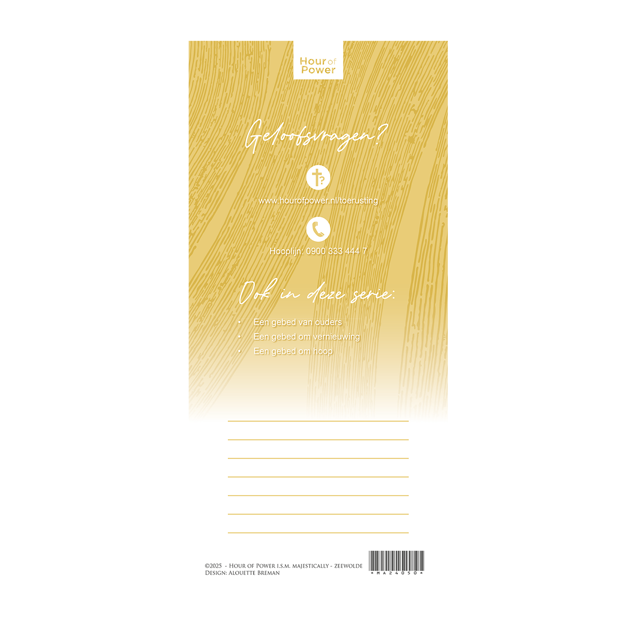 Deze gebedskaart helpt je om stap voor stap doelgericht te bidden: Bij God komen, In jezelf keren, De invloed van God erkennen, De wens van je hart neerleggen, Ervan uitgaan dat God werkt, Nooit stoppen met danken. Perfect voor je stille tijd en geloofsverdieping. Geef deze kaart cadeau als liefdevolle aanmoediging.