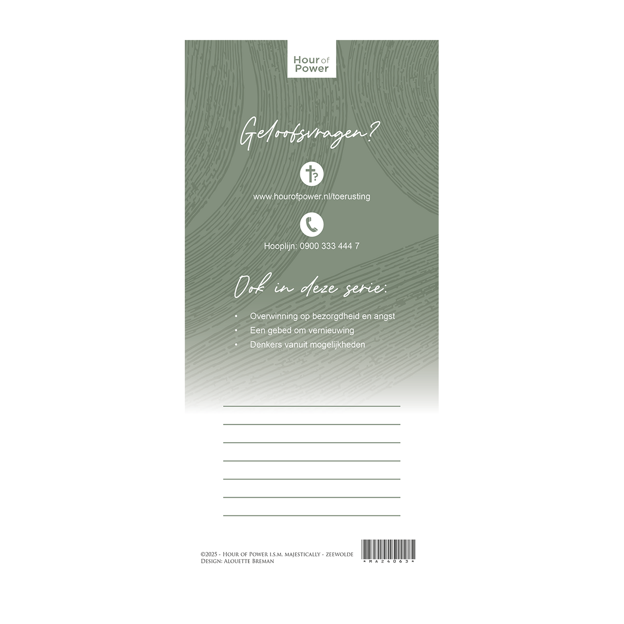 Deze kaart is tot stand gekomen in samenwerking met Hour of Power. Op de achterkant vind je een verwijzing naar de website en de HOOPlijn. Daarnaast is er ruimte om een persoonlijke boodschap toe te voegen.