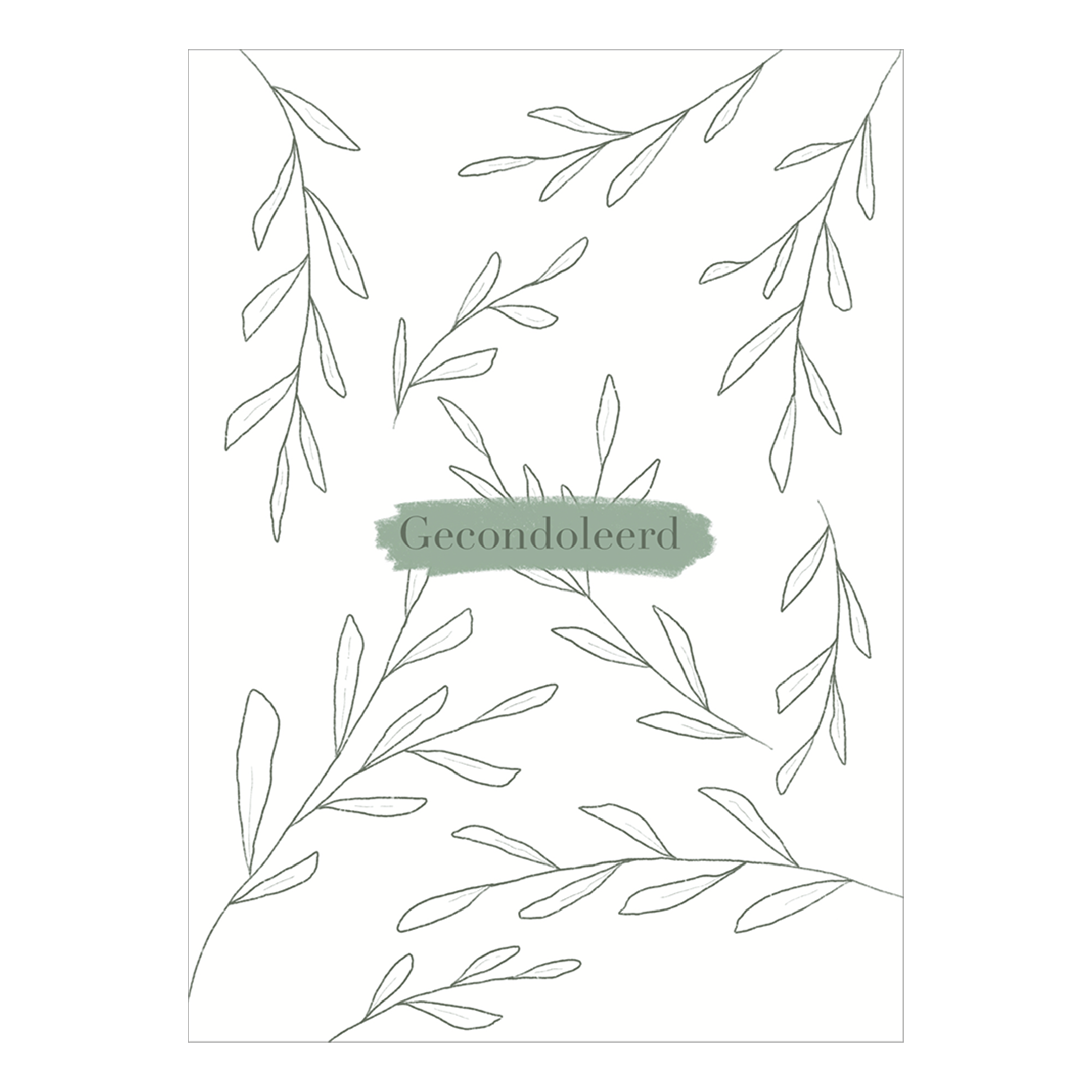 Een enkele kaart op dik papier met de afbeelding van takjes en de tekst ‘ gecondoleerd’.