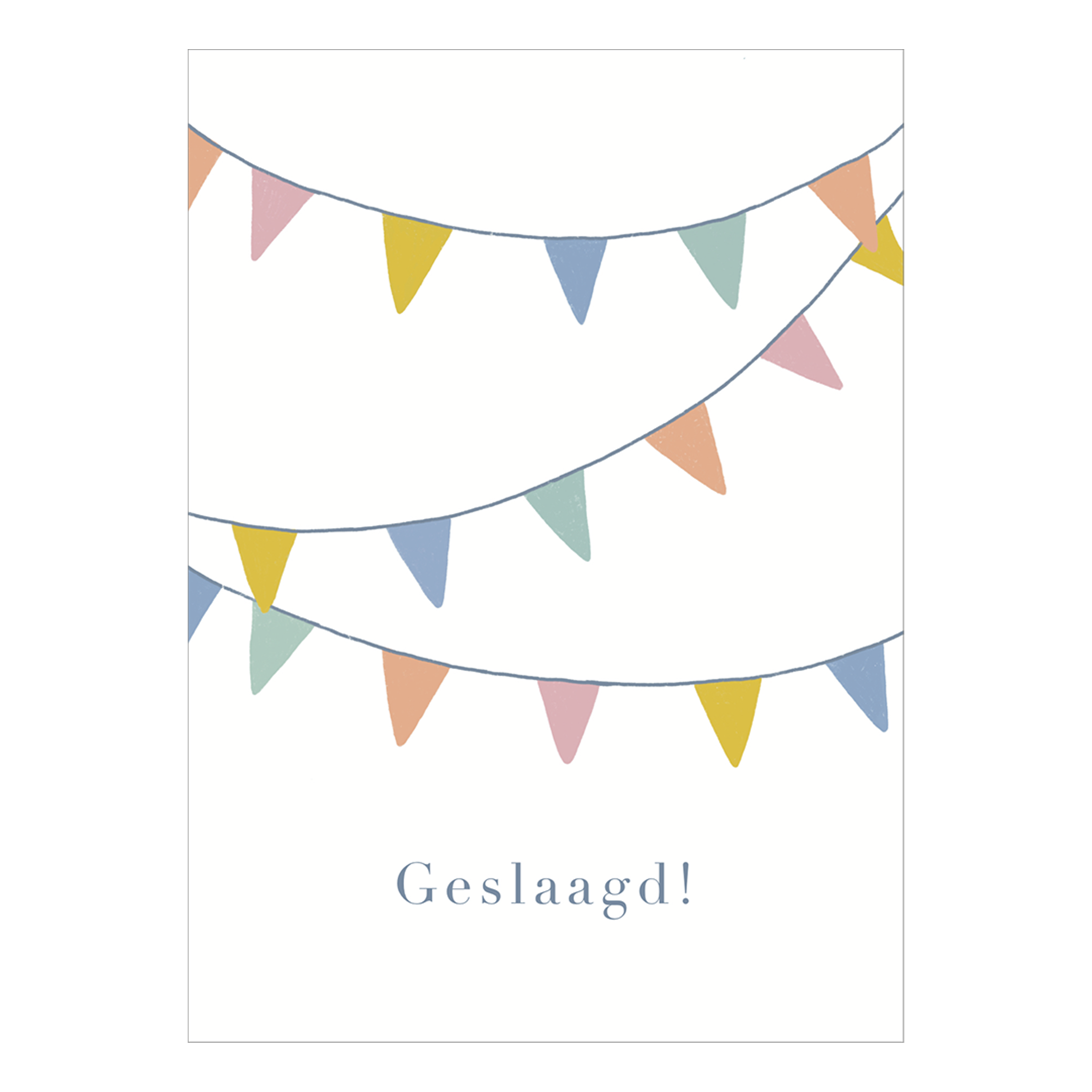Een enkele kaart op dik papier met de afbeelding van vlaggetjes en de tekst ‘Geslaagd!’