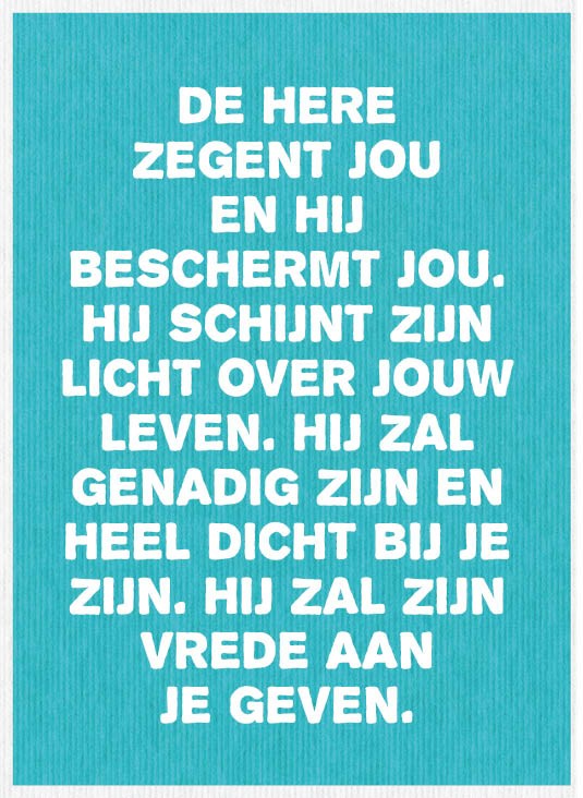 De Here zegent jou en Hij beschermt jou. Hij schijnt Zijn licht over jouw leven. Hij zal genadig zijn en heel dicht bij je zijn. Hij zal zijn vrede aan je geven.