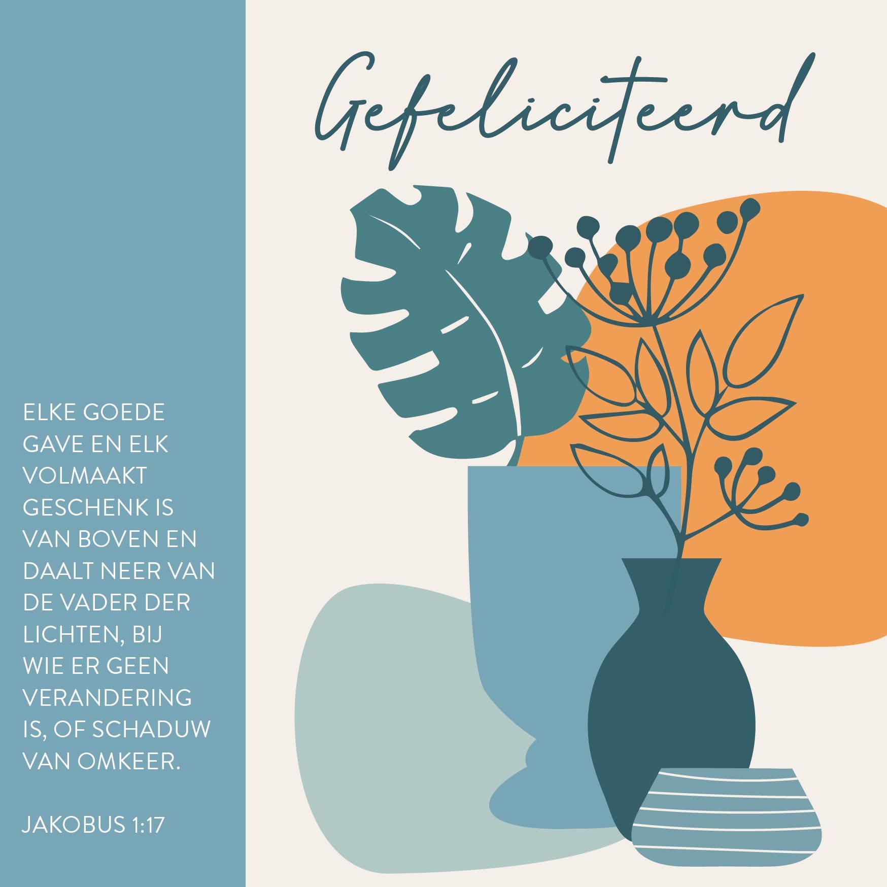 Christelijke enkele kaart van ca. 15 x 15 cm met de tekst: ‘Elke goede gave en elk volmaakt geschenk is van boven en daalt neer van de Vader der lichten, bij Wie er geen verandering is, of schaduw van omkeer.’ De kaart kan aan de blanco achterzijde beschreven worden. Wordt geleverd met envelop. Artikelnummer: MA56036