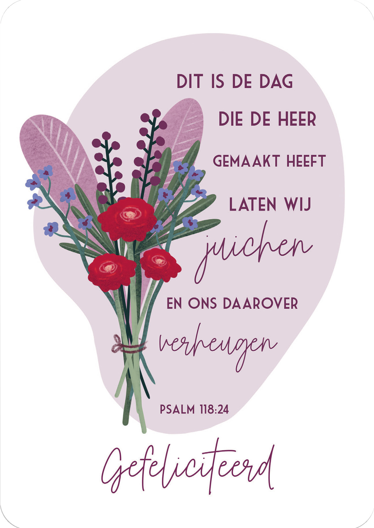 Tekst: ‘Dit is de dag die de Heer gemaakt heeft. Laten wij juichen en ons daarover verheugen – Psalm 118:24. Gefeliciteerd’