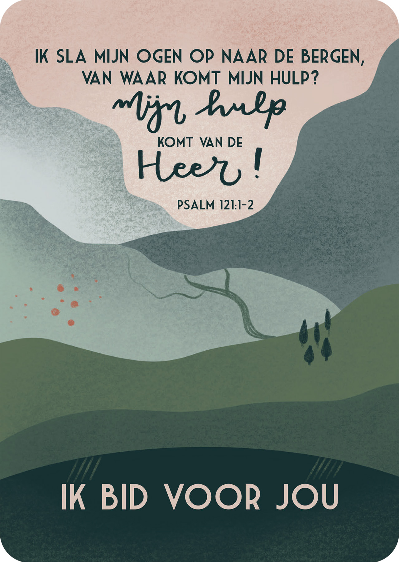 Tekst: ‘Ik sla mijn ogen op naar de bergen, van waar komt mijn hulp? Mijn hulp komt van de Heer! Psalm 121:1-2. Ik bid voor jou!’