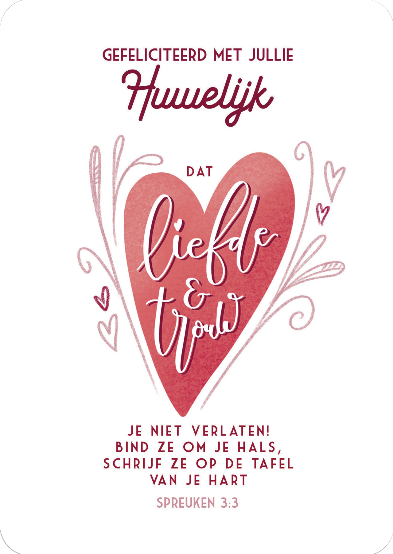 Tekst: ‘Gefeliciteerd met jullie huwelijk. Dat liefde & trouw je niet verlaten! Bind ze om je hals, schrijf ze op de tafel van je hart. Spreuken 3:3’