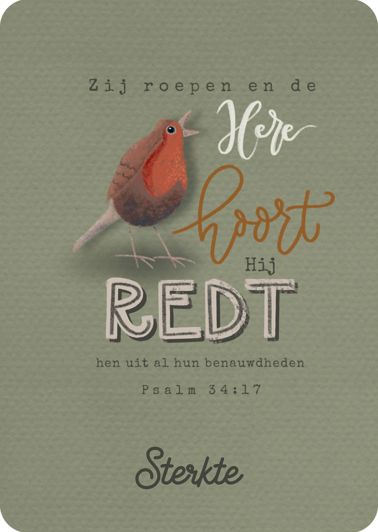 Tekst: ‘”Zij roepen en de Here hoort. Hij redt hen uit al hun benauwdheden.” -Psalm 34:17. Sterkte’