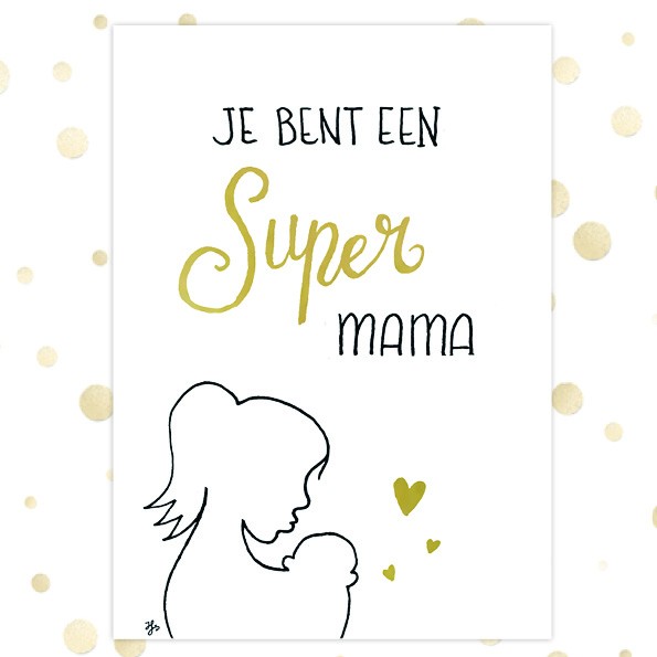 Op zoek naar een kaartje voor een moeder? Deze enkele kaart van extra stevig karton met de tekst ‘Je bent een super mama’ is daarvoor zeer geschikt. Het woord ‘super’ en de hartjes zijn afgedrukt in goudfolie. Het gebruik van het goud op deze kaart geeft een extra leuk accent. De kaart is aan de achterzijde goed te beschrijven en wordt geleverd met envelop.