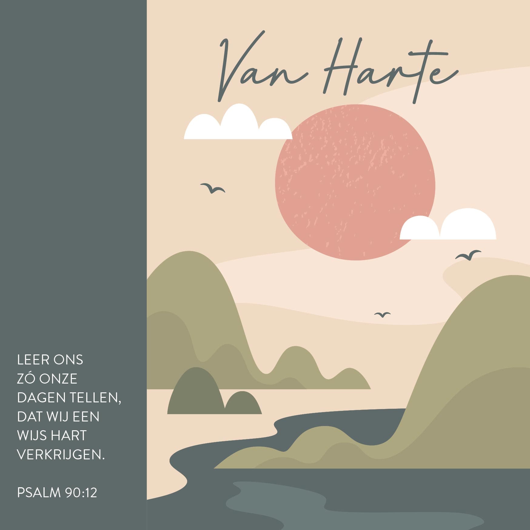 Christelijke enkele kaart van ca. 15 x 15 cm met de tekst: ‘Leer ons zó onze dagen tellen, dat wij een wijs hart verkrijgen.’ De kaart kan aan de blanco achterzijde beschreven worden. Wordt geleverd met envelop. Artikelnummer: MA56025