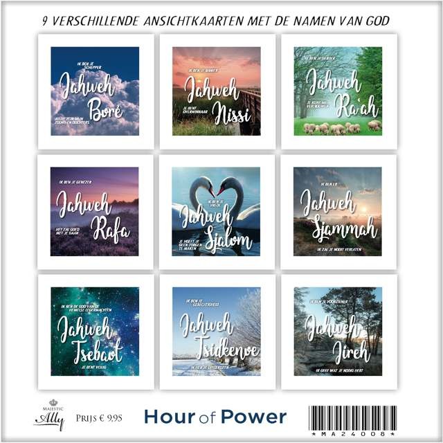 Een kaartenset van 9 verschillende kaarten gebaseerd op de prekenserie ‘Namen van God’ van Bobby Schuller (Hour of Power). De afbeeldingen komen uit het boek ‘Ik Ben’. Een sfeervol geschenkboek, voor jezelf maar ook voor een ander. Vierkant formaat (21×21 cm).