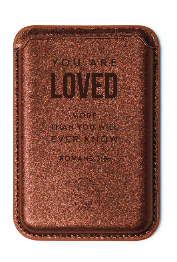 Superhandige, magnetische kaarthouder voor op je mobiele telefoon met de mooie tekst: You are loved more than you will ever know – Romans 5:8