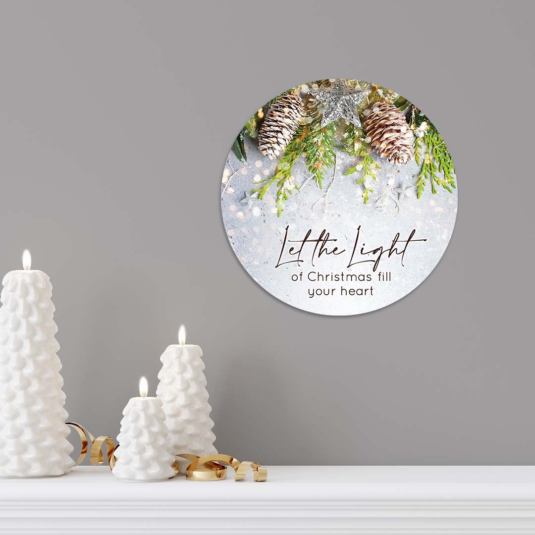 Rond bord in kerstsfeer met de tekst ‘Let the Light’