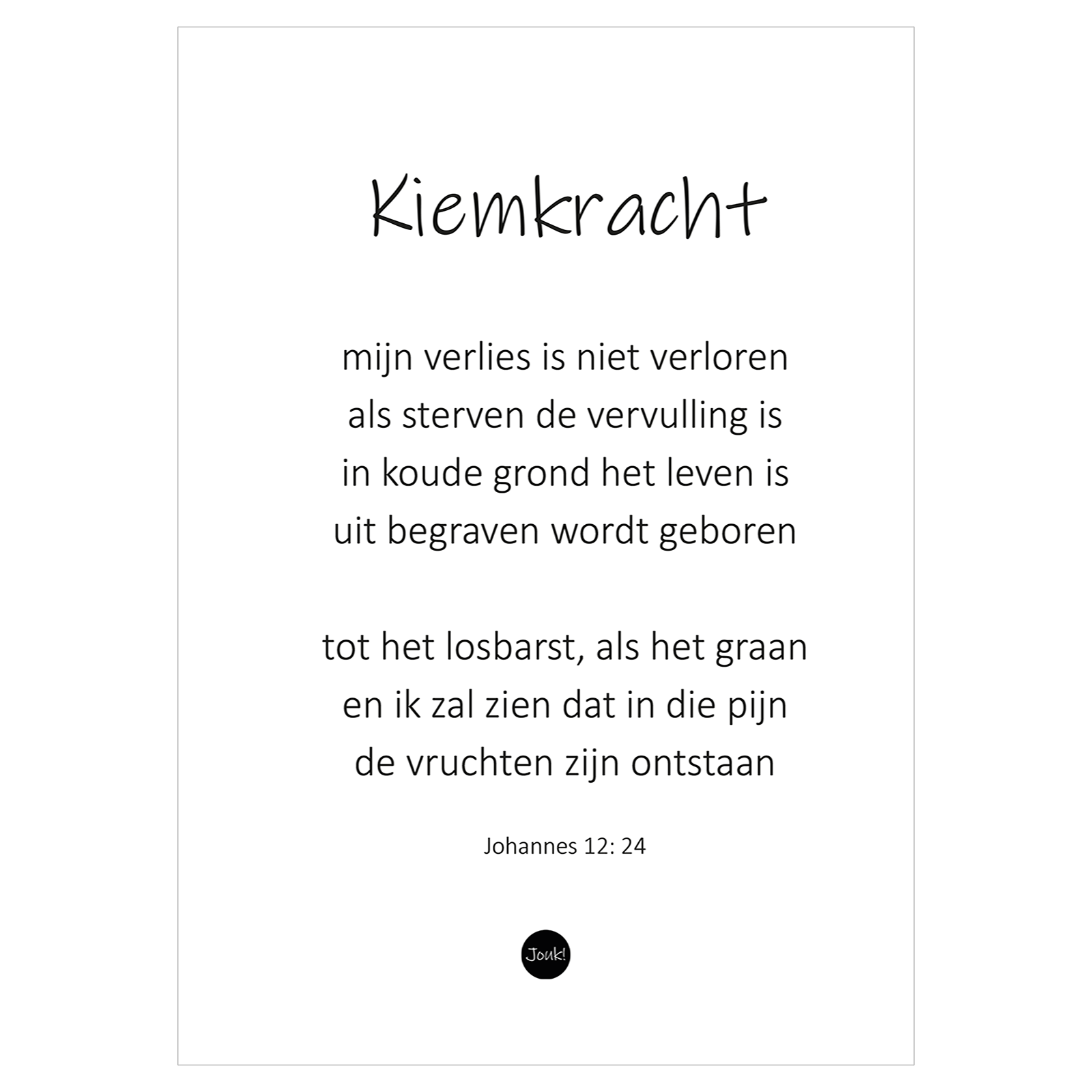 Deze kaart in A6-formaat wordt geleverd met envelop. Door het rustige design in zwart en wit, gaat alle aandacht naar de woorden van hoop, liefde en bemoediging.Onderdeel van de kaartenserie Knipoogje!