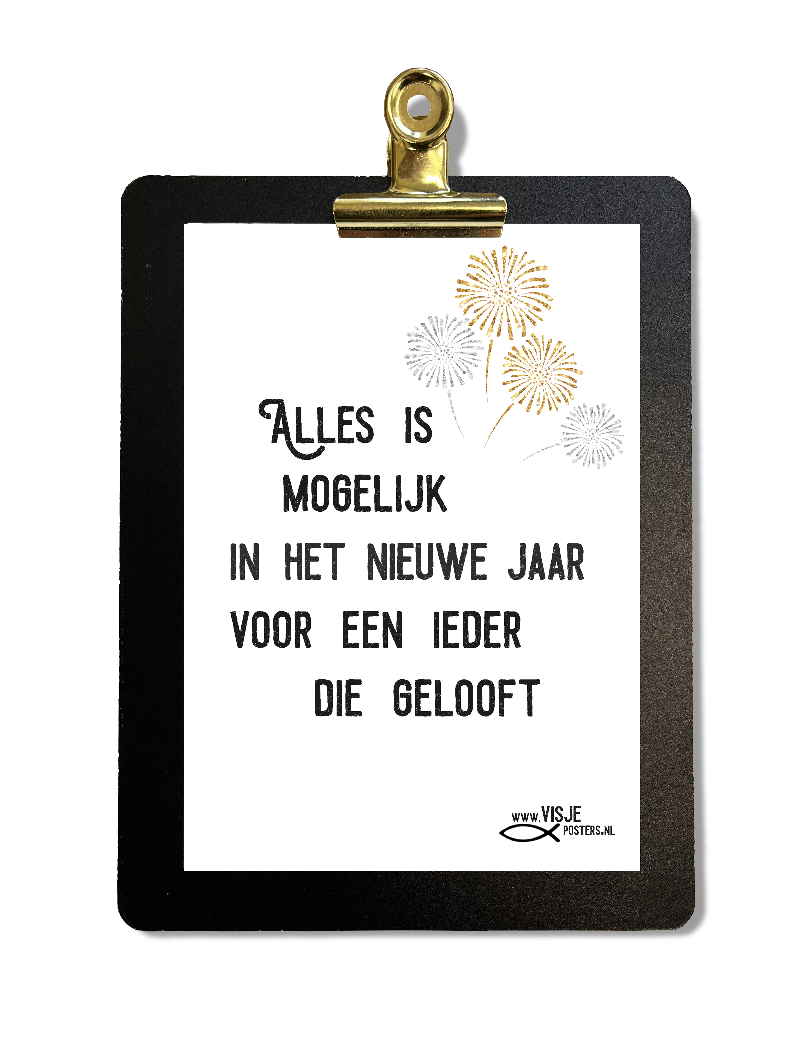 De kaart draagt een inspirerende boodschap: “Alles is mogelijk in het nieuwe jaar voor een ieder die gelooft.”