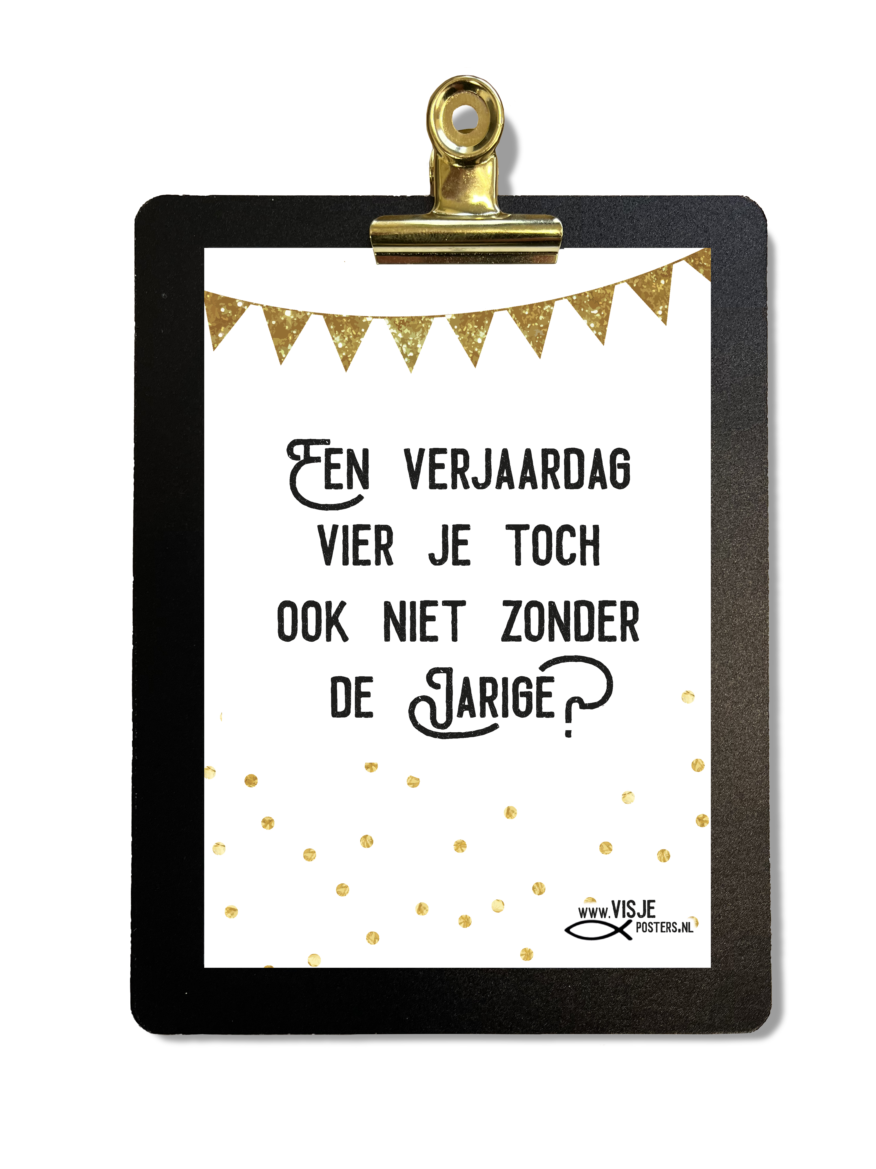 Dit stijlvolle klembordje (17,5 x 13,5 cm) zorgt ervoor dat de kaart met de boodschap “Een verjaardag vier je toch ook niet zonder jarige?” prachtig opvalt in elk interieur.