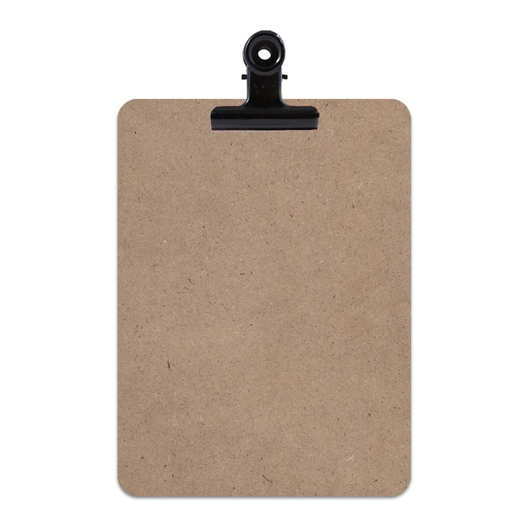 Een klein, stevig klembordje van bruin karton met een goudkleurige klem. Leuk als cadeautje, bedankje of om een kaartje mee te presenteren.