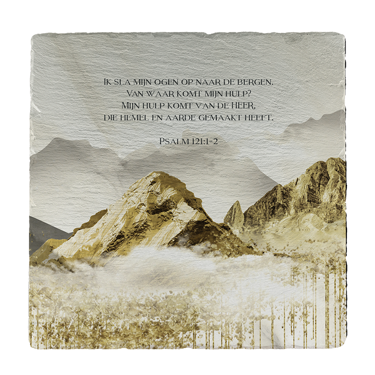 Deze elegante leisteen, versierd met bergen en de bijbeltekst uit Psalm 121:1-2 is afgewerkt met subtiele goudaccenten.