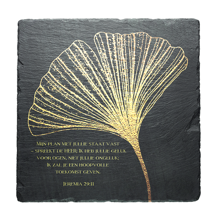 Op deze leisteen staat de bijbeltekst uit Jeremia 29:11: ‘Mijn plan met jullie staat vast – spreekt de HEER: Ik heb jullie geluk voor ogen, niet jullie ongeluk; Ik zal je een hoopvolle toekomst geven.’
