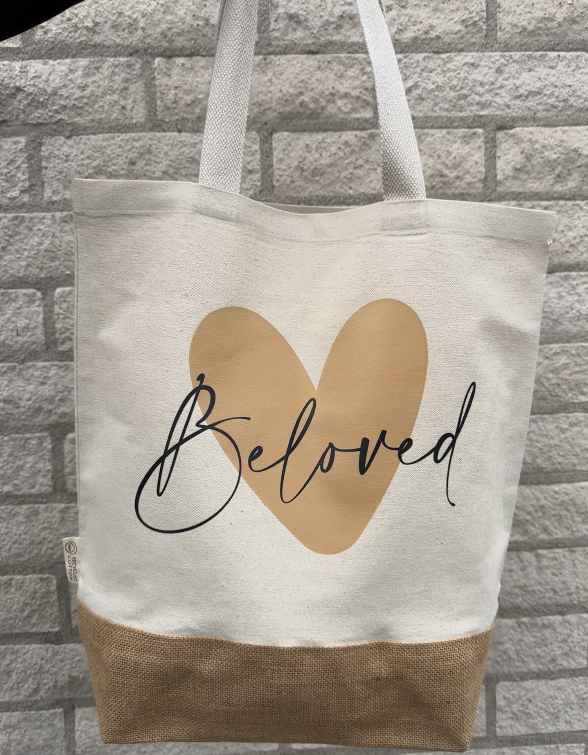 Linnen schoudertas bedrukt met de tekst ‘Beloved’. Afmeting 37×37 cm.