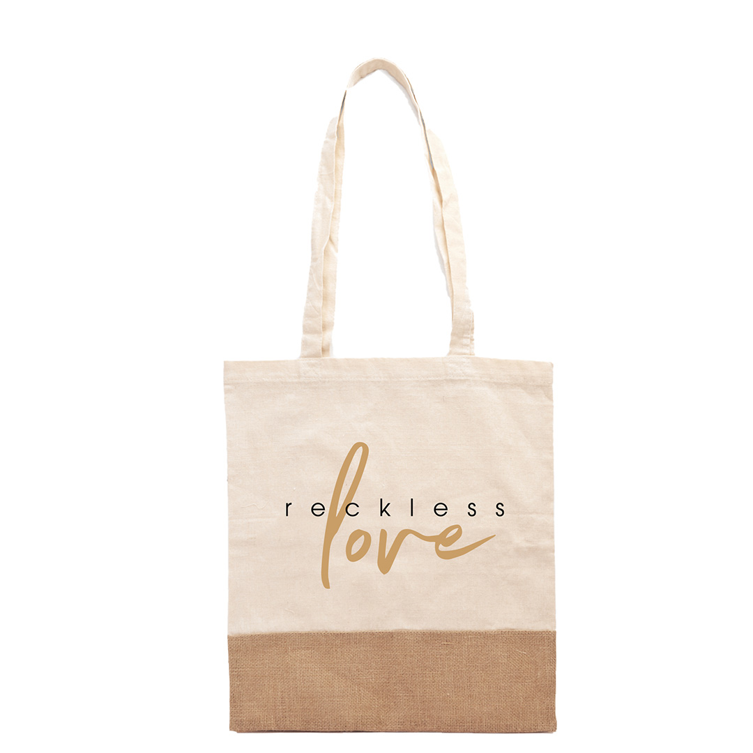 Deze katoenen tas met de opdruk ‘Reckless love’ heeft de afmetingen van ca. 40×36 cm. De tas heeft aan de voorzijde een strook jute aan de onderzijde. Leuk om mee te nemen op je dagje uit!