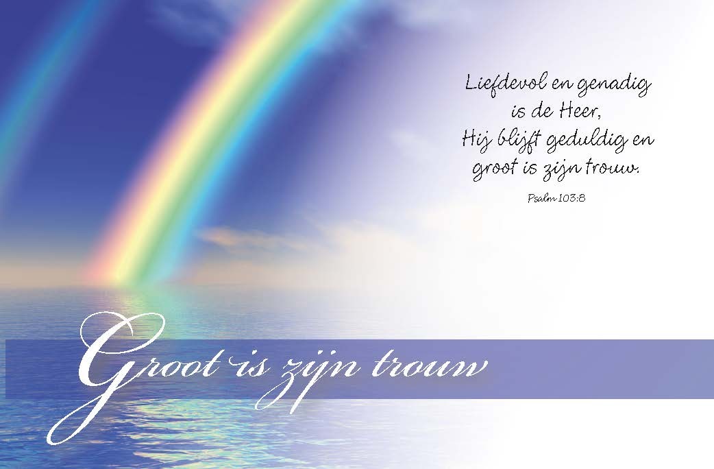 Minikaart ‘Groot is zijn trouw’ Mooie kaartjes met bijpassende Bijbelteksten.Deze kaartjes zijn afgeleid van de serie Square-kaarten (vierkante kaarten). De minikaartjes worden geleverd op visitekaartjes-formaat.