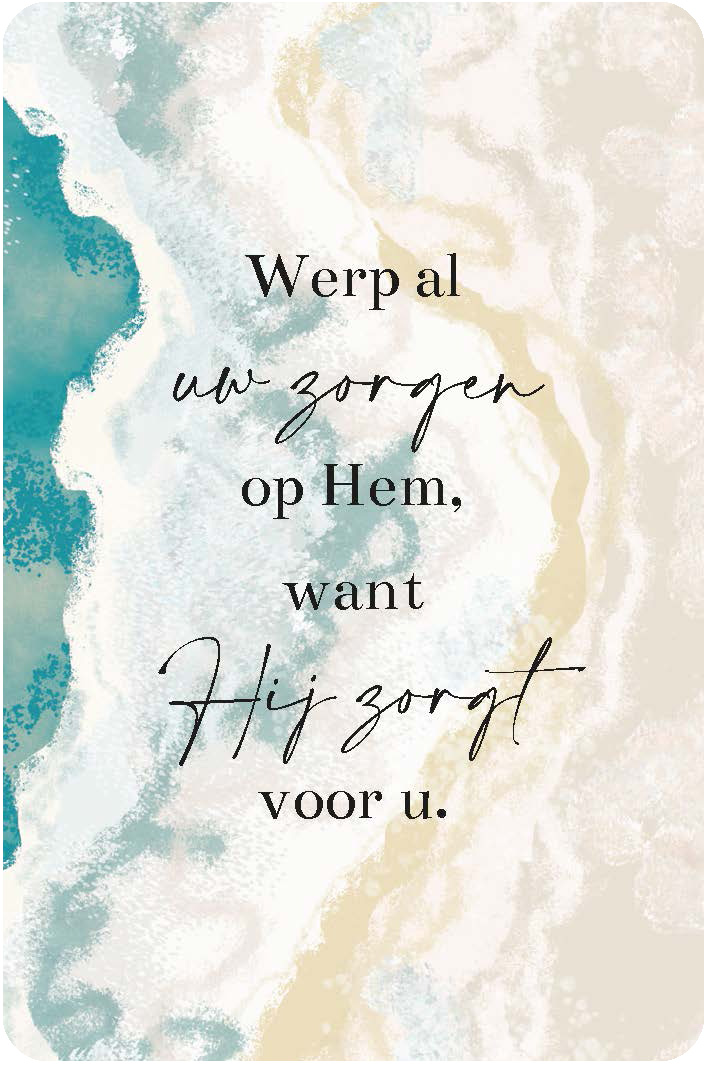 Leuk minikaartje met de tekst ‘Werp al uw zorgen op Hem, want Hij zorgt voor u’. Perfect om een persoonlijke boodschap toe te voegen aan je cadeau of om een liefdevolle boodschap aan een geliefde te schrijven. De kaarten hebben een blanco achterzijde, zodat deze goed beschreven kan worden.