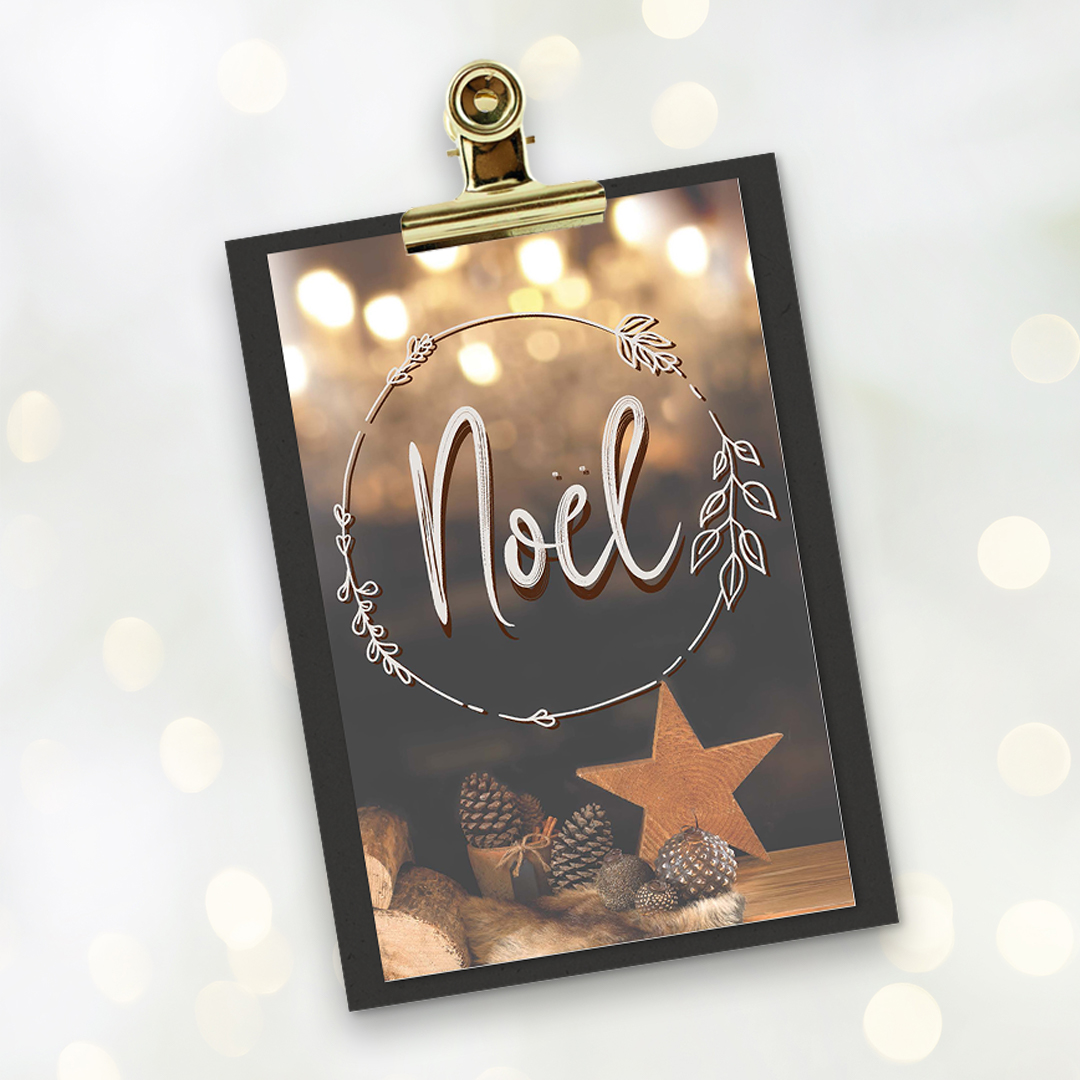 Prachtig kerstkaartje met de tekst ‘Noël’, bevestigd op een zwart klembordje met gouden klemmetje. Leuk om cadeau te doen en iemand een hart onder de riem te steken. Dit item is ook als losse kaart te verkrijgen in onze webshop. Er is keuze uit verschillende ontwerpen in dezelfde serie.
