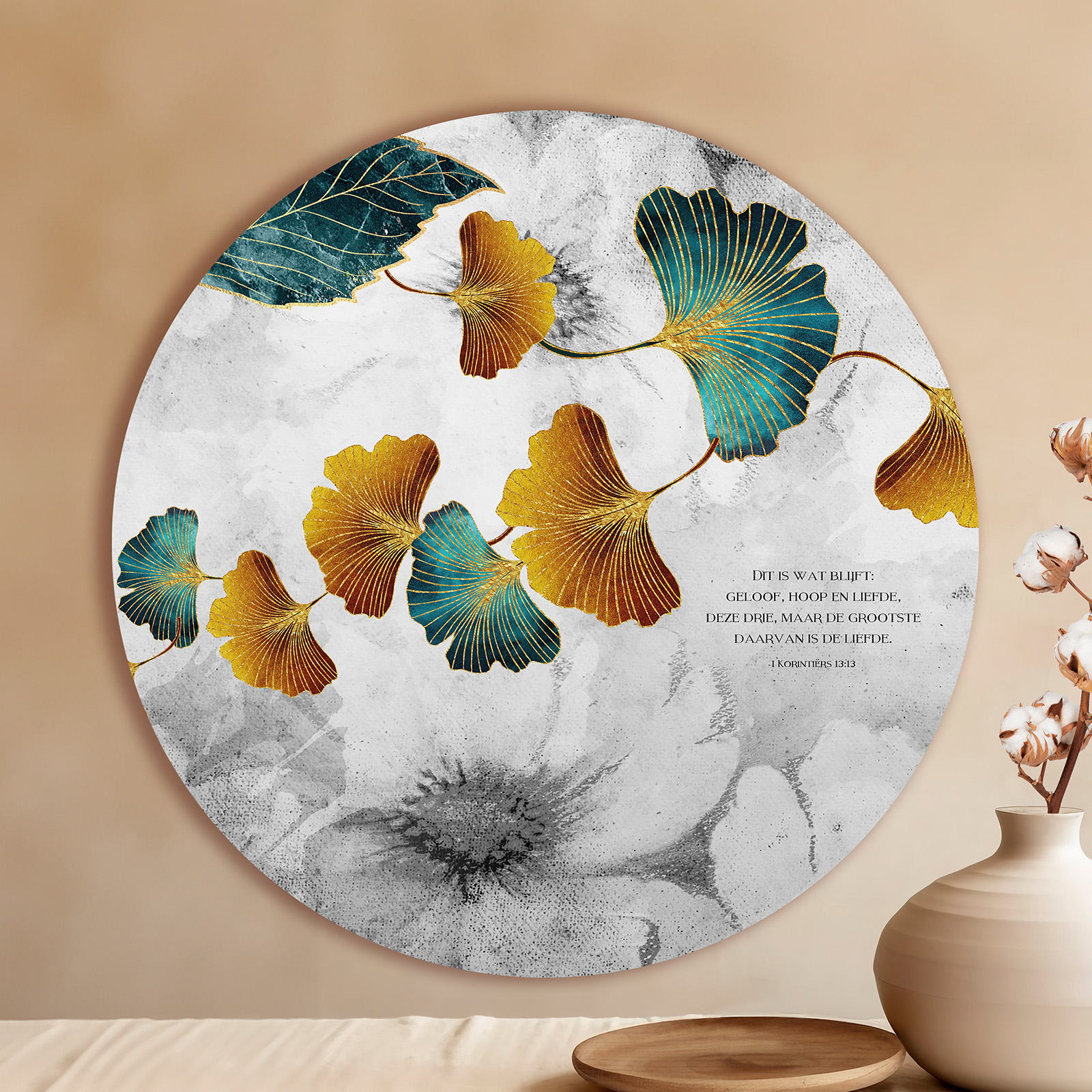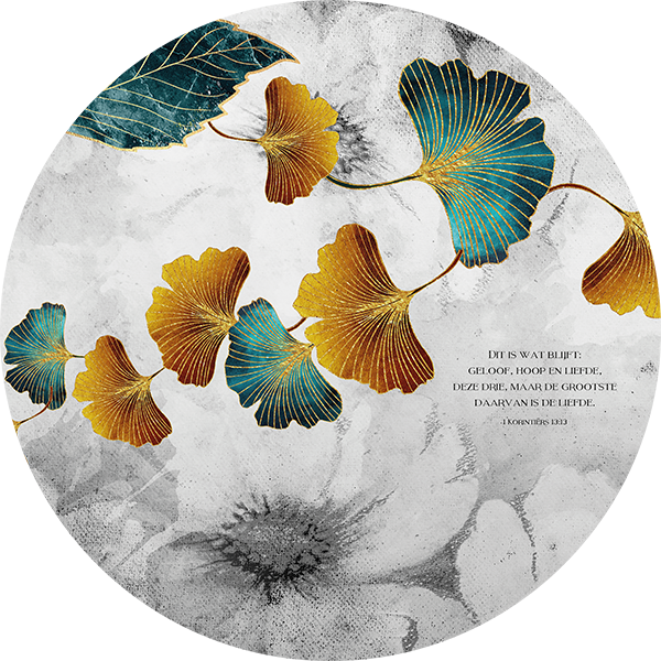 Op deze cirkel staat de bijbeltekst uit 1 Korintiërs 13:13: ‘Dit is wat blijft: geloof, hoop en liefde, deze drie, maar de grootste daarvan is de liefde.’
