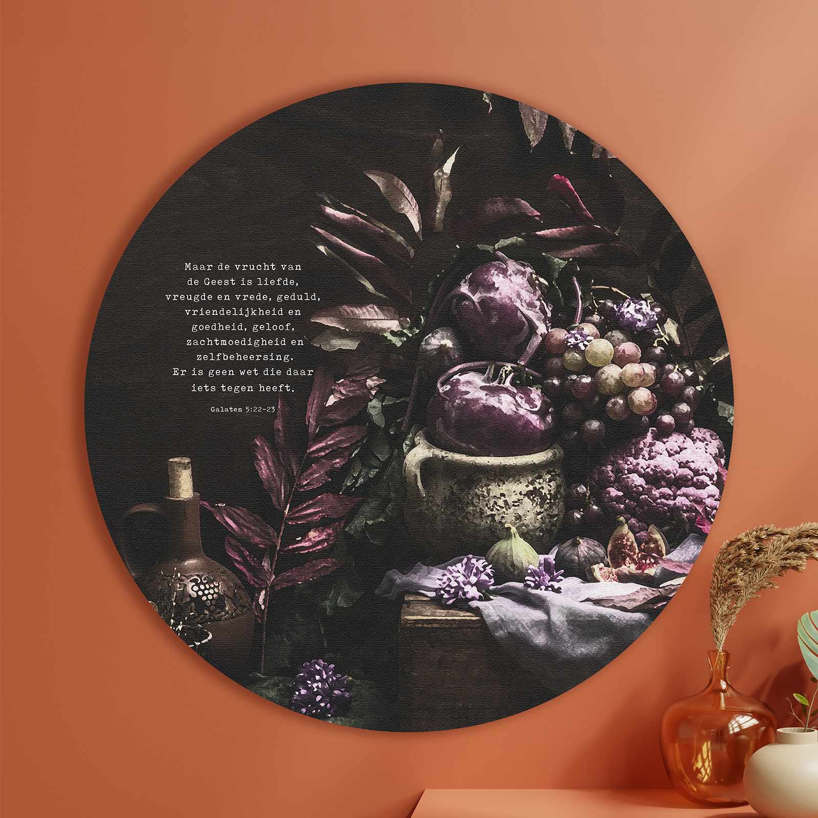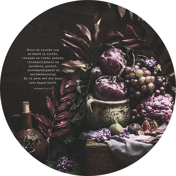 Op deze cirkel staat de bijbeltekst uit Galaten 5:22-23: ‘Maar de vrucht van de Geest is liefde, vreugde en vrede, geduld, vriendelijkheid en goedheid, geloof, zachtmoedigheid en zelfbeheersing. Er is geen wet die daar iets tegen heeft.’