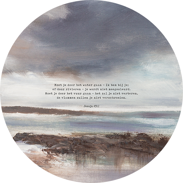 Op deze cirkel staat de bijbeltekst uit Jesaja 43:2: ‘Moet je door het water gaan – Ik ben bij je; of door rivieren – je wordt niet meegesleurd. Moet je door het vuur gaan – het zal je niet verteren, de vlammen zullen je niet verschroeien.’