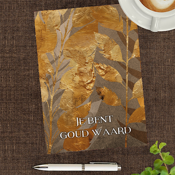 Dit stijlvolle notitieblok met goudkleurige accenten en de tekst ‘Je bent goud waard’ is perfect voor het vastleggen van dagelijkse notities, quotes of mooie uitspraken.