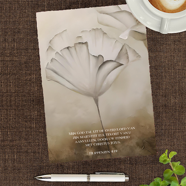 Dit stijlvolle notitieblok met een prachtige afbeelding van een klaproos en de inspirerende tekst uit Filippenzen 4:19 is ideaal voor het noteren van dagelijkse gedachten, citaten of mooie uitspraken.