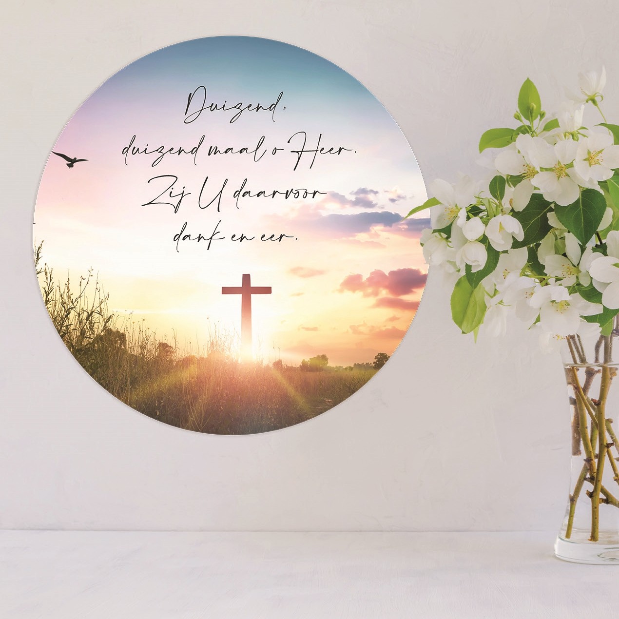 is een sfeervolle toevoeging aan je interieur, speciaal voor de 40-dagentijd en Pasen. De afbeelding toont een opkomende zon met het kruis op de voorgrond, omringd door stralen als teken van hoop en verlossing. Dit christelijke decoratiebord is niet alleen mooi tijdens Pasen, maar ook daarna een blijvende herinnering aan Jezus’ opstanding.