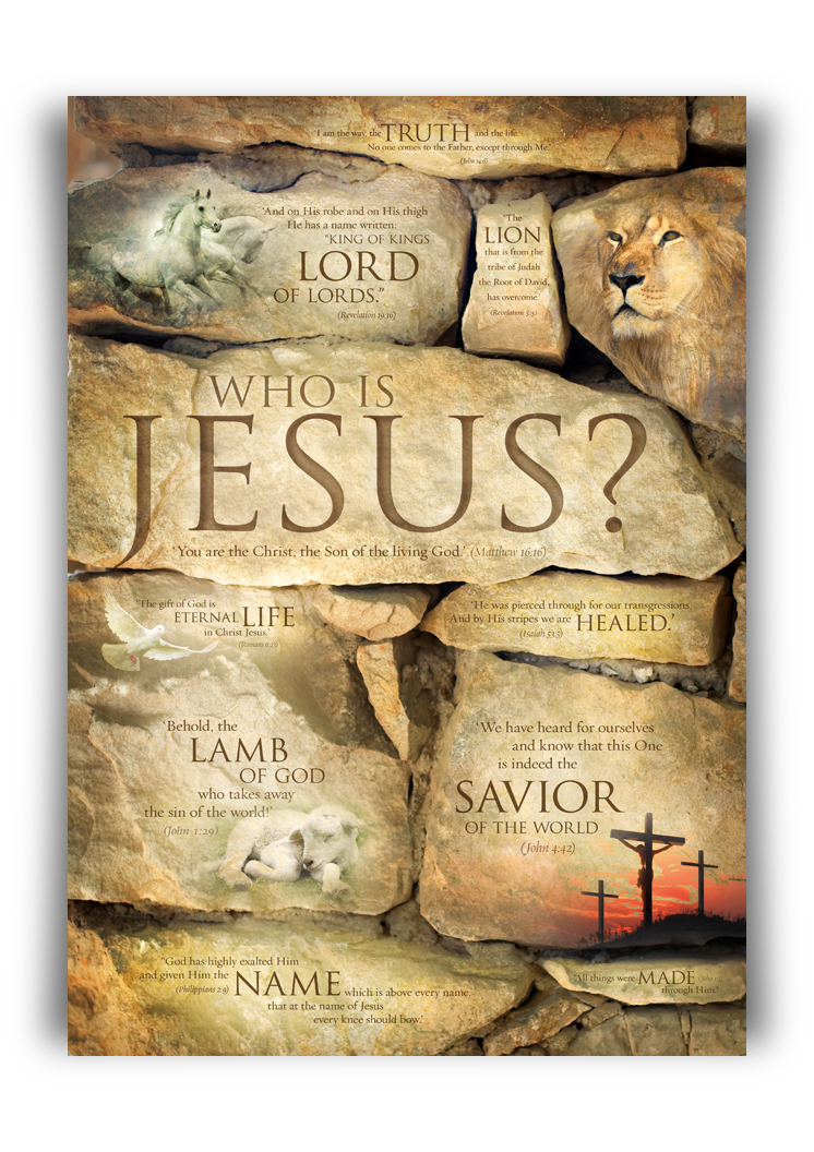 Poster met namen en beschrijvingen van Jezus