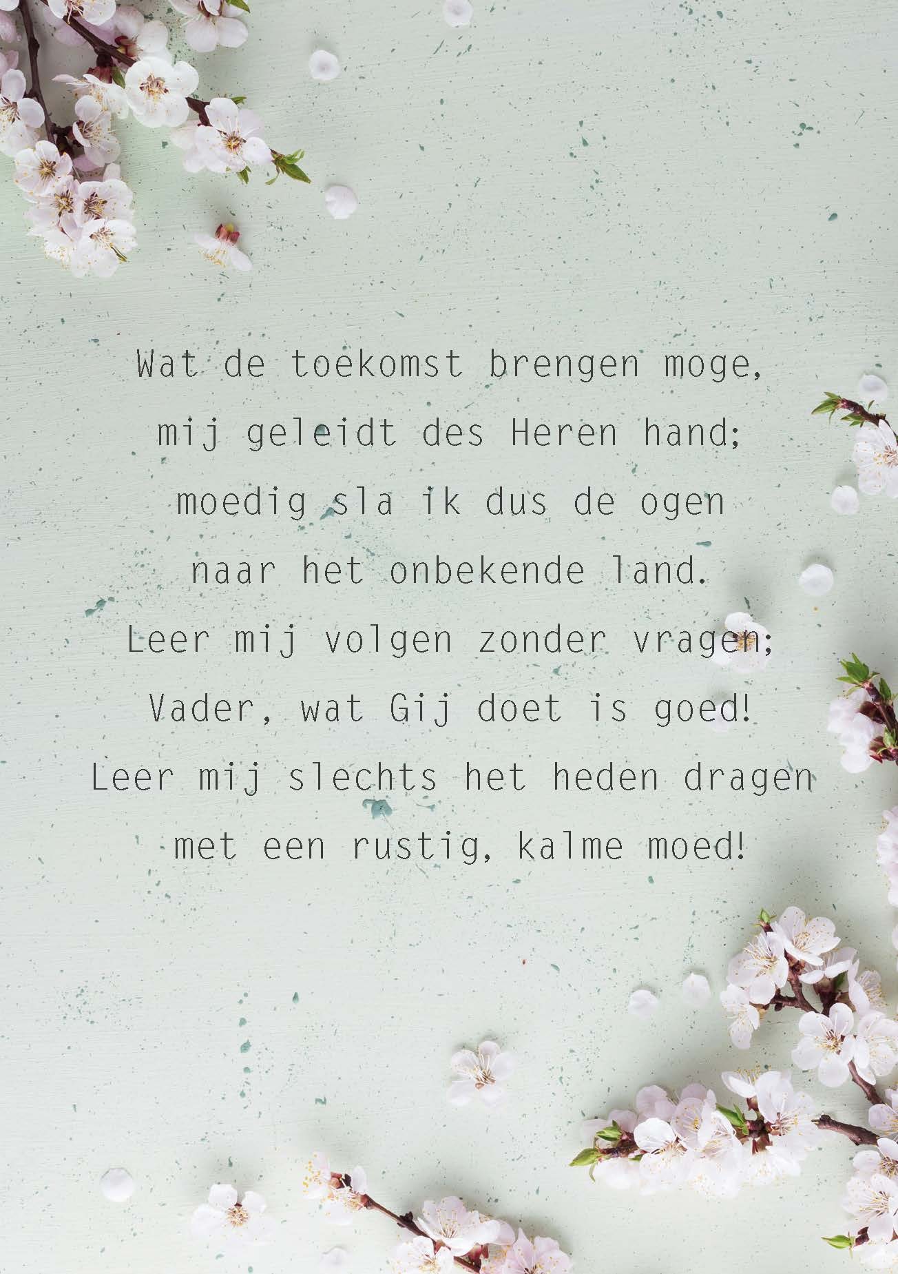 “Wat de toekomst brengt moge, mij geleidt des Heren hand; moedig sla ik dus de ogen naar het onbekende land.