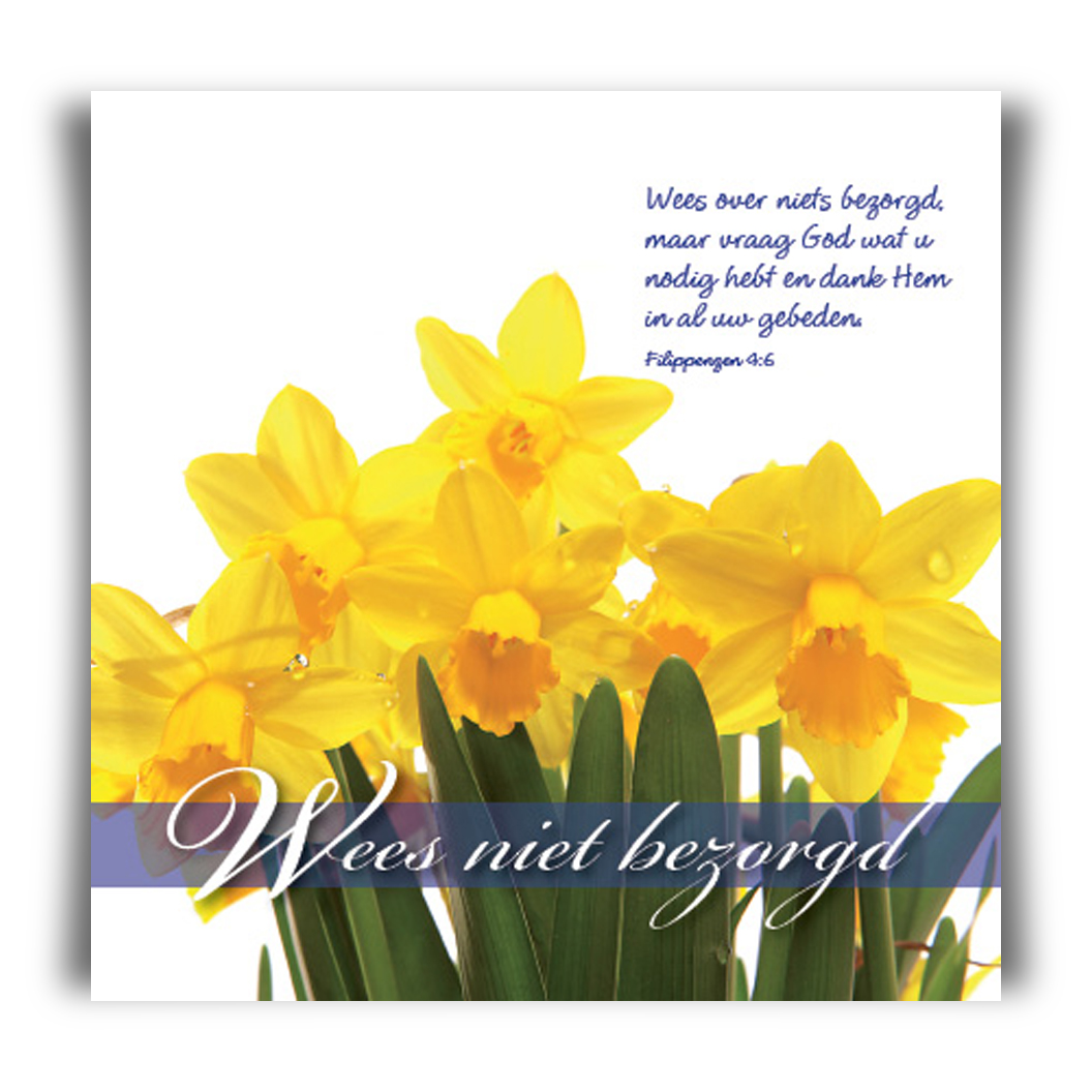 Christelijke ansichtkaart van ca 15×15 cm met bijpassende Bijbeltekst en afbeeldingen uit de natuur. De kaart kan aan de achterzijde beschreven en geadresseerd worden.