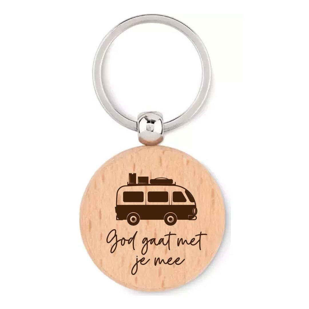Leuke houten sleutelhanger met de tekst ‘God gaat met je mee’.