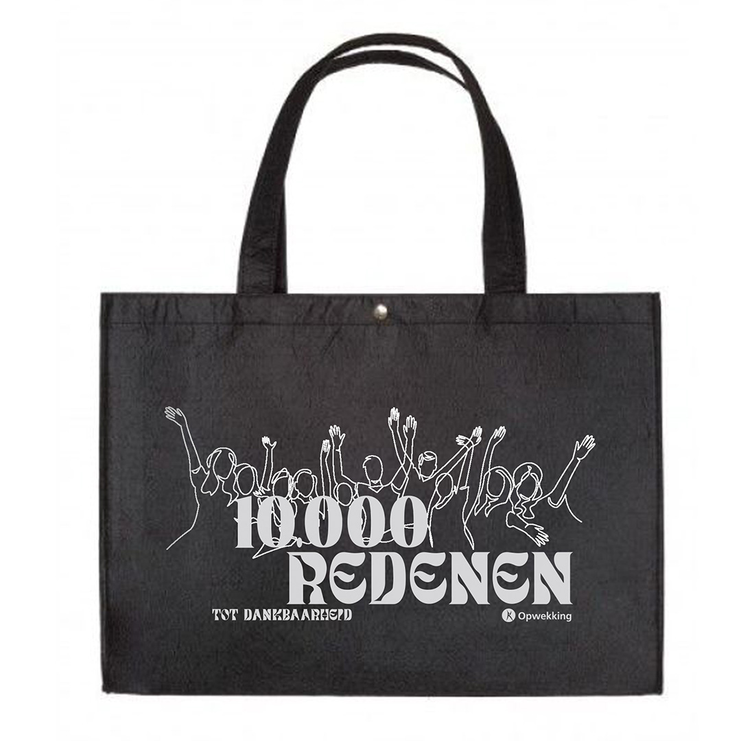 Deze vilten tas met de opdruk ‘10.000 redenen tot dankbaarheid’ heeft de afmetingen van ca. 45×33 cm. Leuk om mee te nemen op je dagje uit!